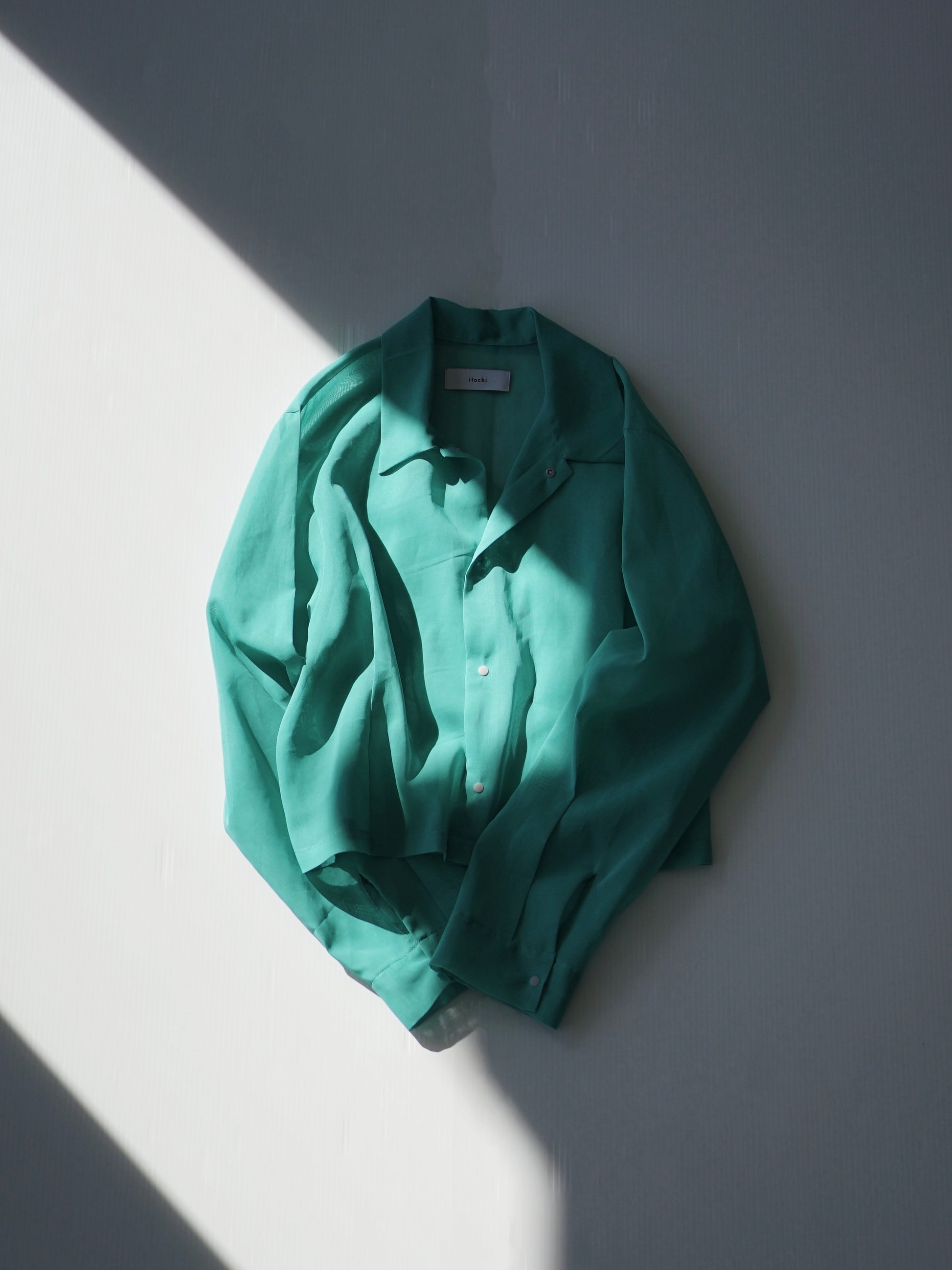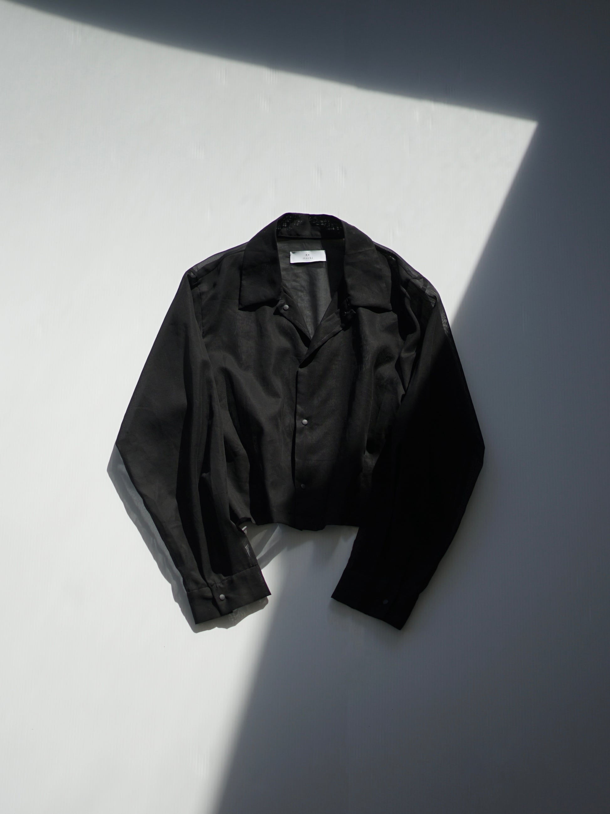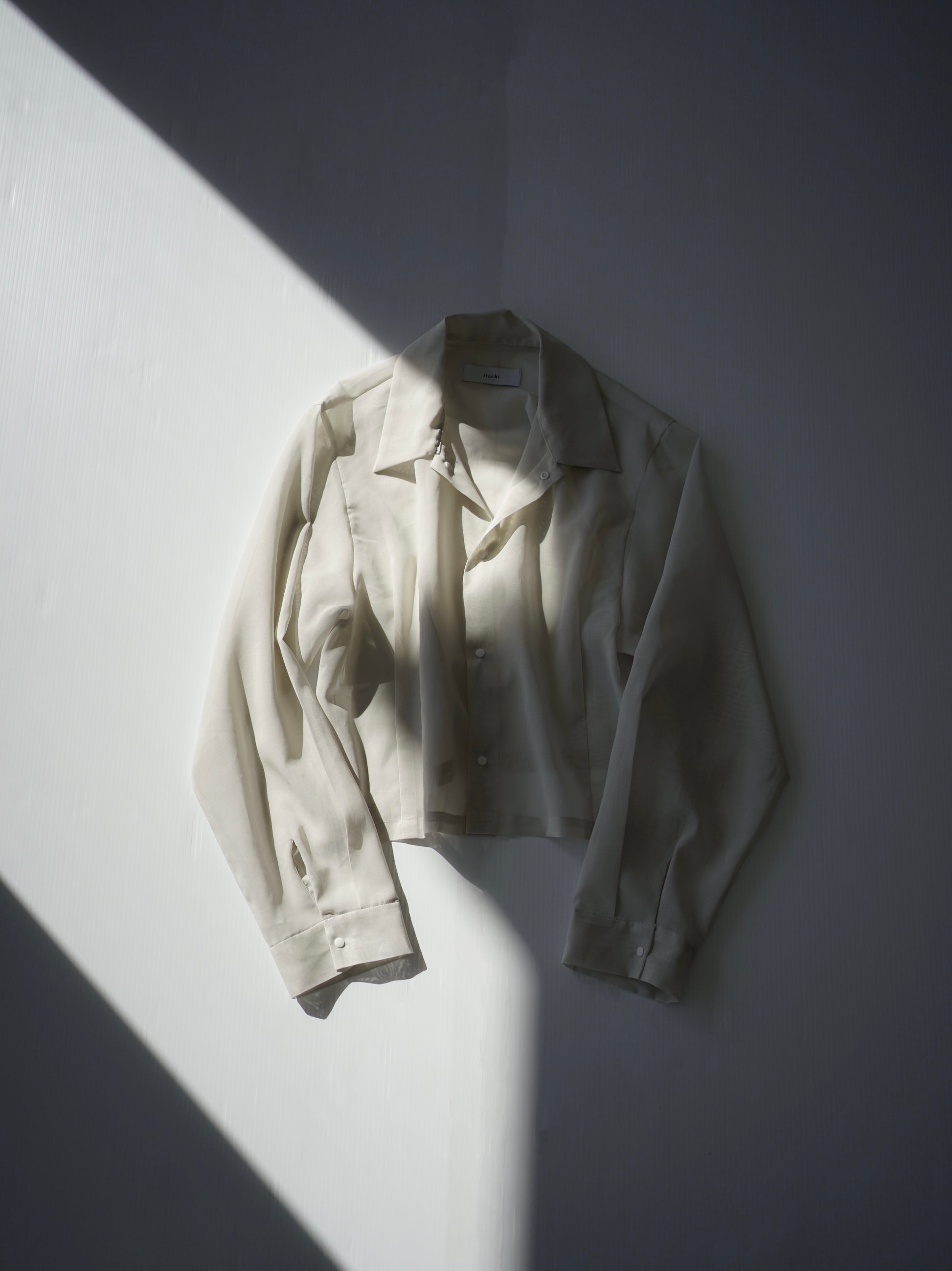 細番手のコットンの糸で織った上品な透け感が特徴のオーガンジーを使ったコンパクトなシャツ、 素材感を活かすためのシンプルなデザインの中に、ウエストのタックが少しフェミニンな印象。