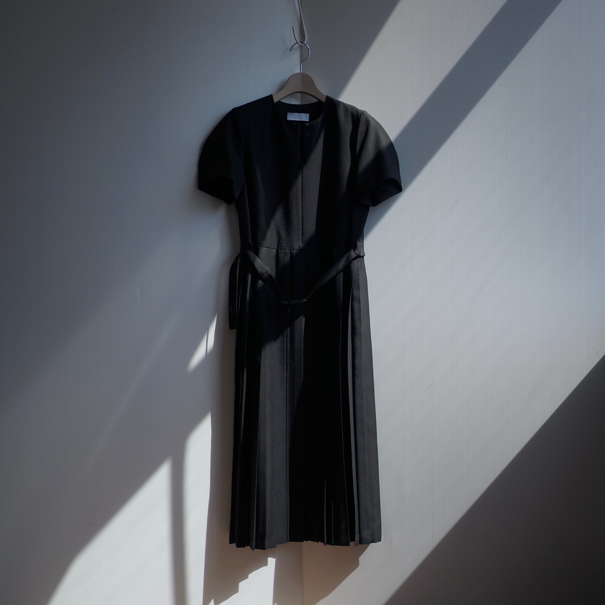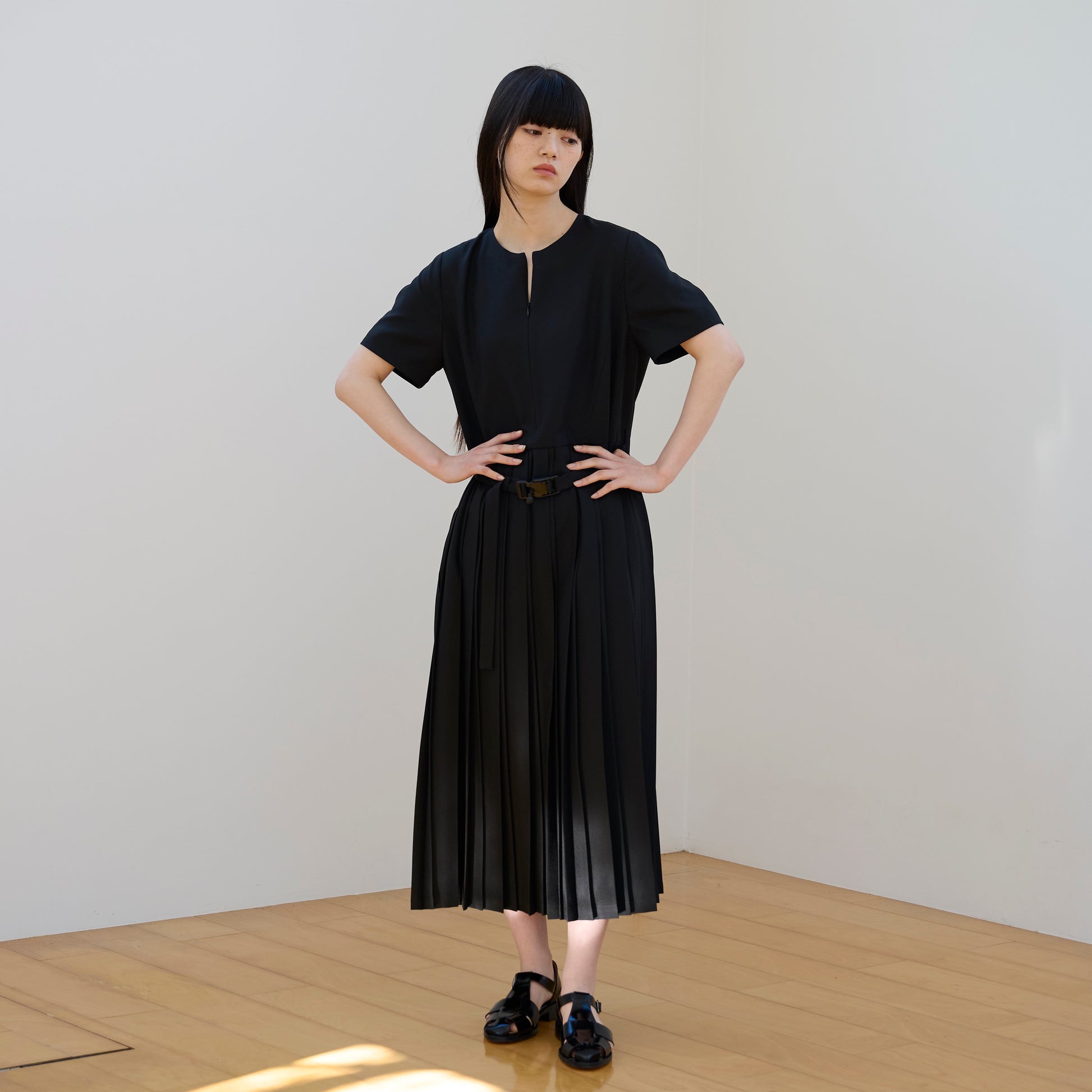 丸みを帯びた身頃と袖の形状と、直線的なスカート部分のプリーツのギャップが特徴のワンピース。