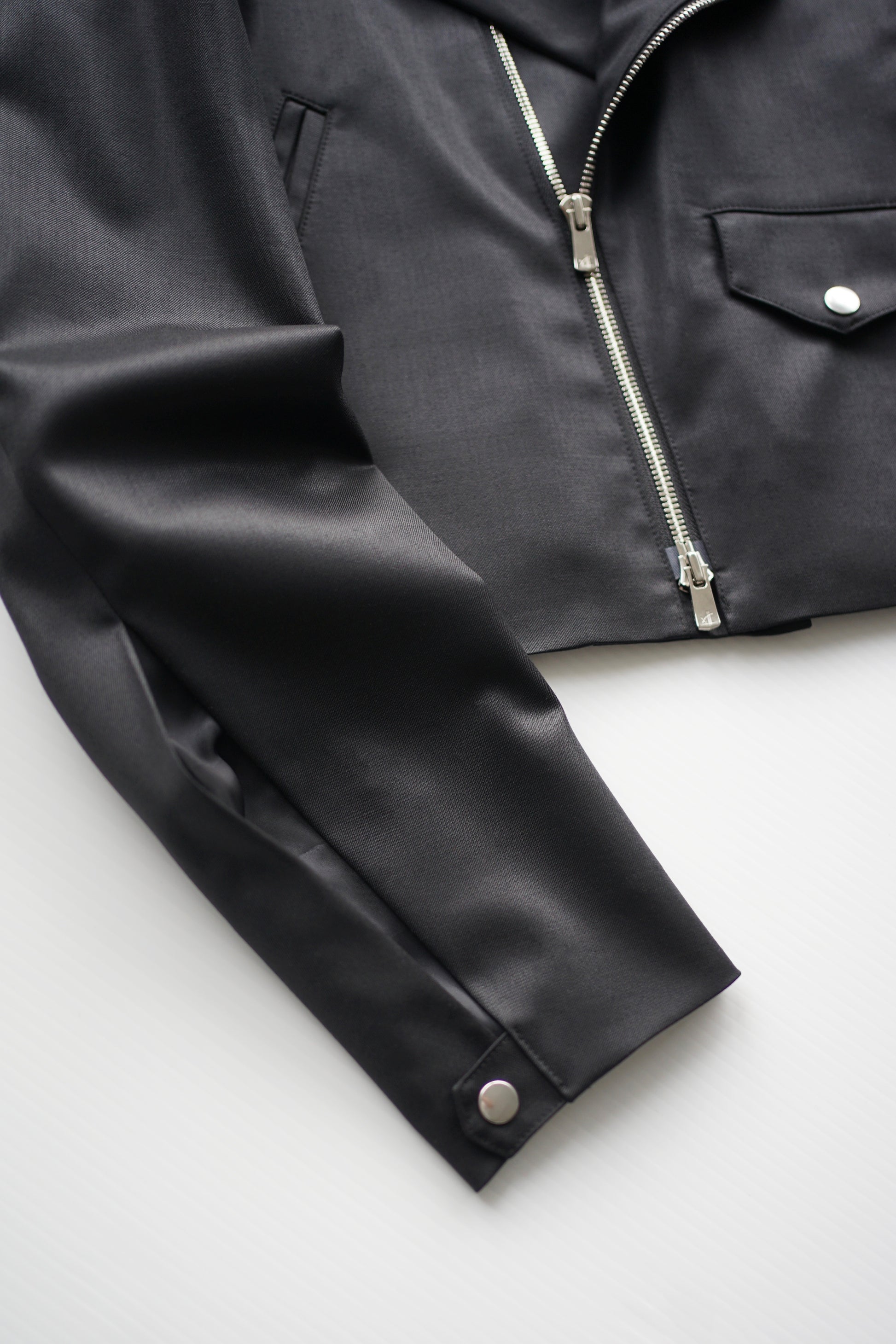 世界三大毛織物の産地「尾州」は葛利毛織工業株式会社の“織機から生まれたレザー調毛織物”を使用したダブルライダースジャケット。
